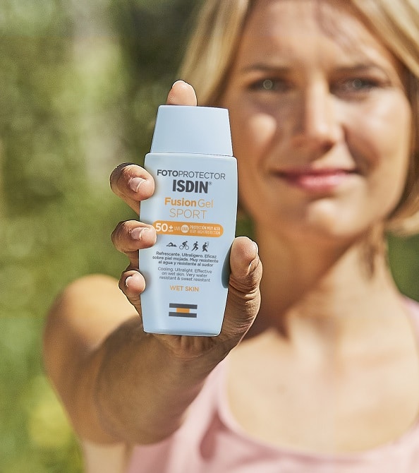 Fusion Gel Sport, fotorpotector oil free de Isdin, de textura gel diseñado especialmente para deportistas. Protege la piel de la radiación UVB y UVA con una protección muy alta SPF 50+.